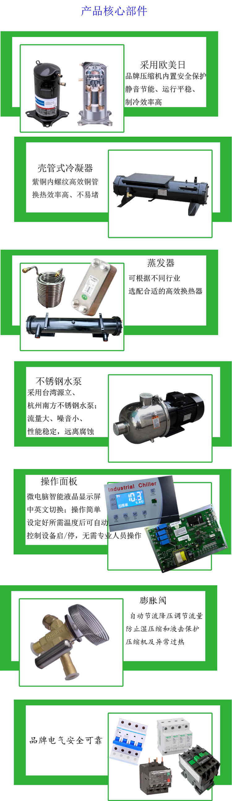 开放式冷水机内置不锈钢水箱及管道水泵,外形美观大方,配置完善,主要构件均由钢体外壳保护,可安放于生产车间内,安装简单,使用、维护方便。开放式冷水机不自带水箱及水泵,可根据需要外接水泵及水箱,优点是水箱的容积及水泵扬程不受限制,能更好地满足不同的工业设备配套需要。采用现代产品可靠性设计理念,辅以计算机优化系统设计。机组配置小型壳管式换热器, 处于最佳运行工作点,产品可靠性高。